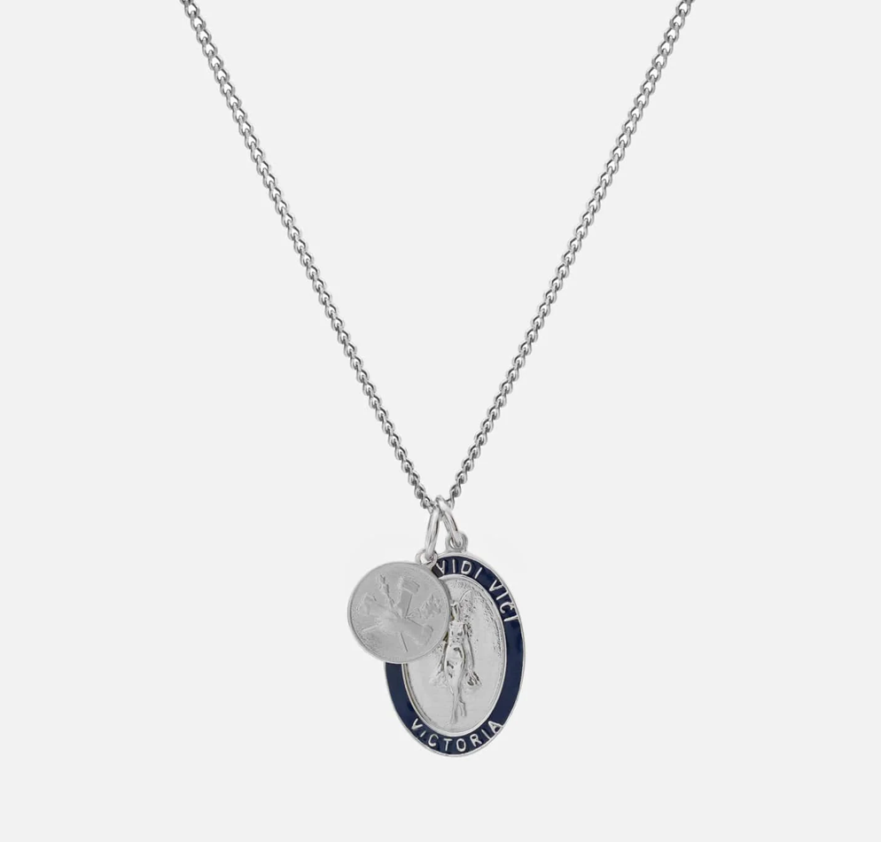 The Victoria Pendant Necklace for men interprets the symbolic phrase "Love Conquers All" through the juxtaposition of a rose, dagger, and the goddess of victory. Constructed from polished sterling silver with navy enamel detailing, hanging on a 24-inch chain.